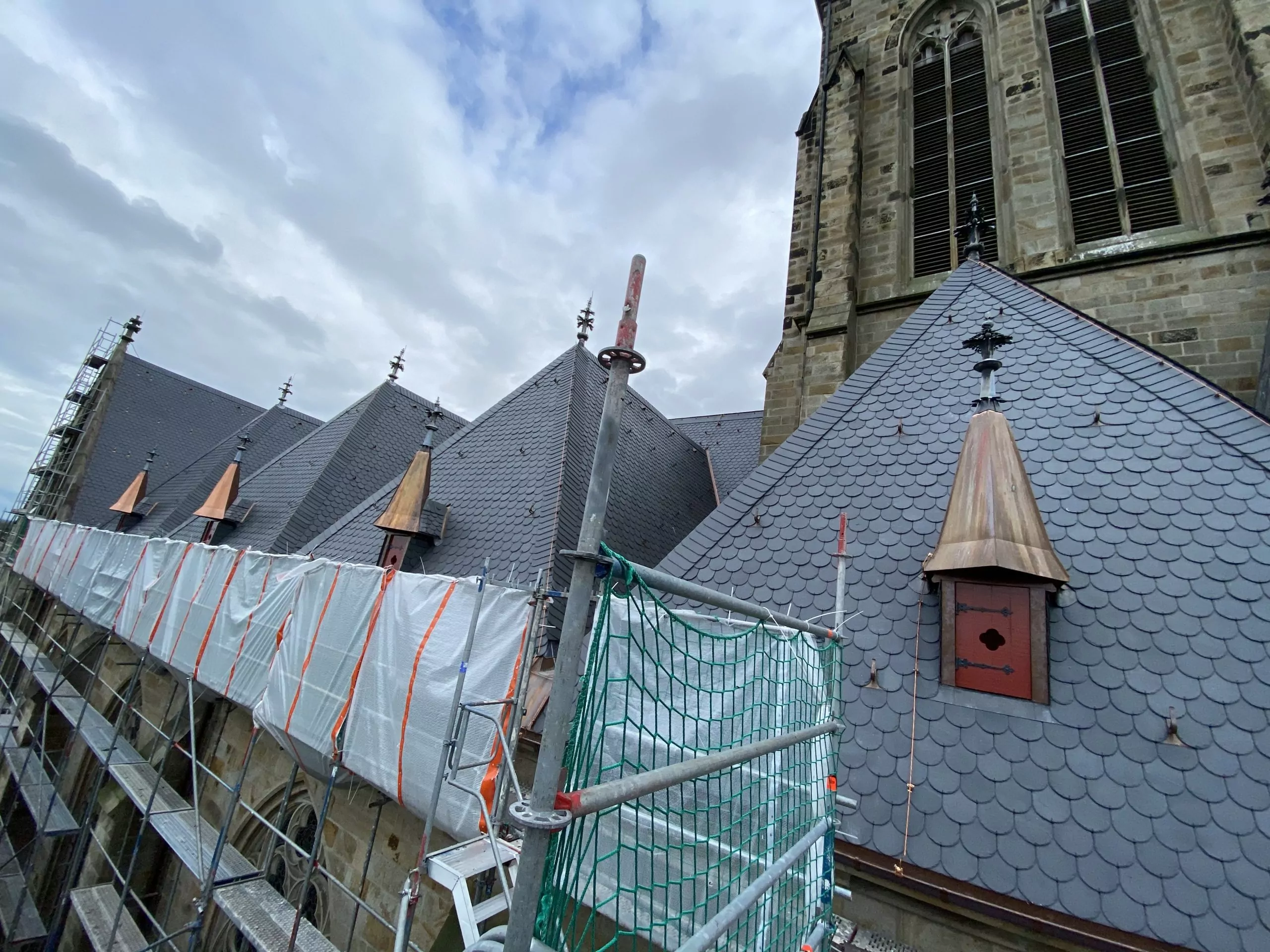 Die Bauarbeiten erfolgten in luftiger Höhe mit Blick über die Stadt – und mit großem Respekt vor dem historischen Bestand. Auch das Wetterkreuz, verschiedene Firstzierden sowie Elemente des Blitzschutzsystems wurden in den Sanierungsprozess integriert und denkmalgerecht aufbereitet.